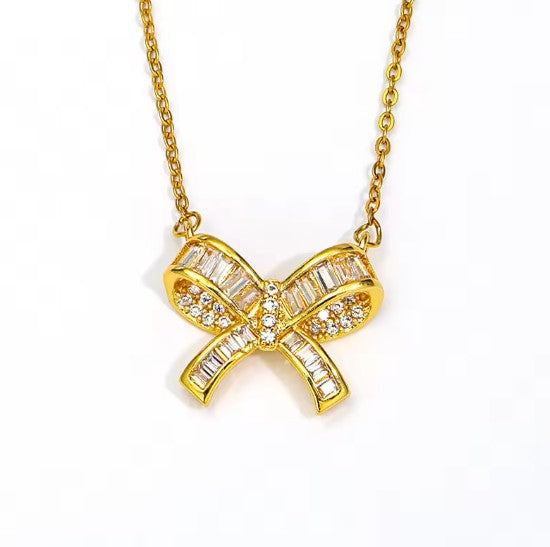 Gold Plated Stainless Steel Bow Pendant with CZ stones Necklace